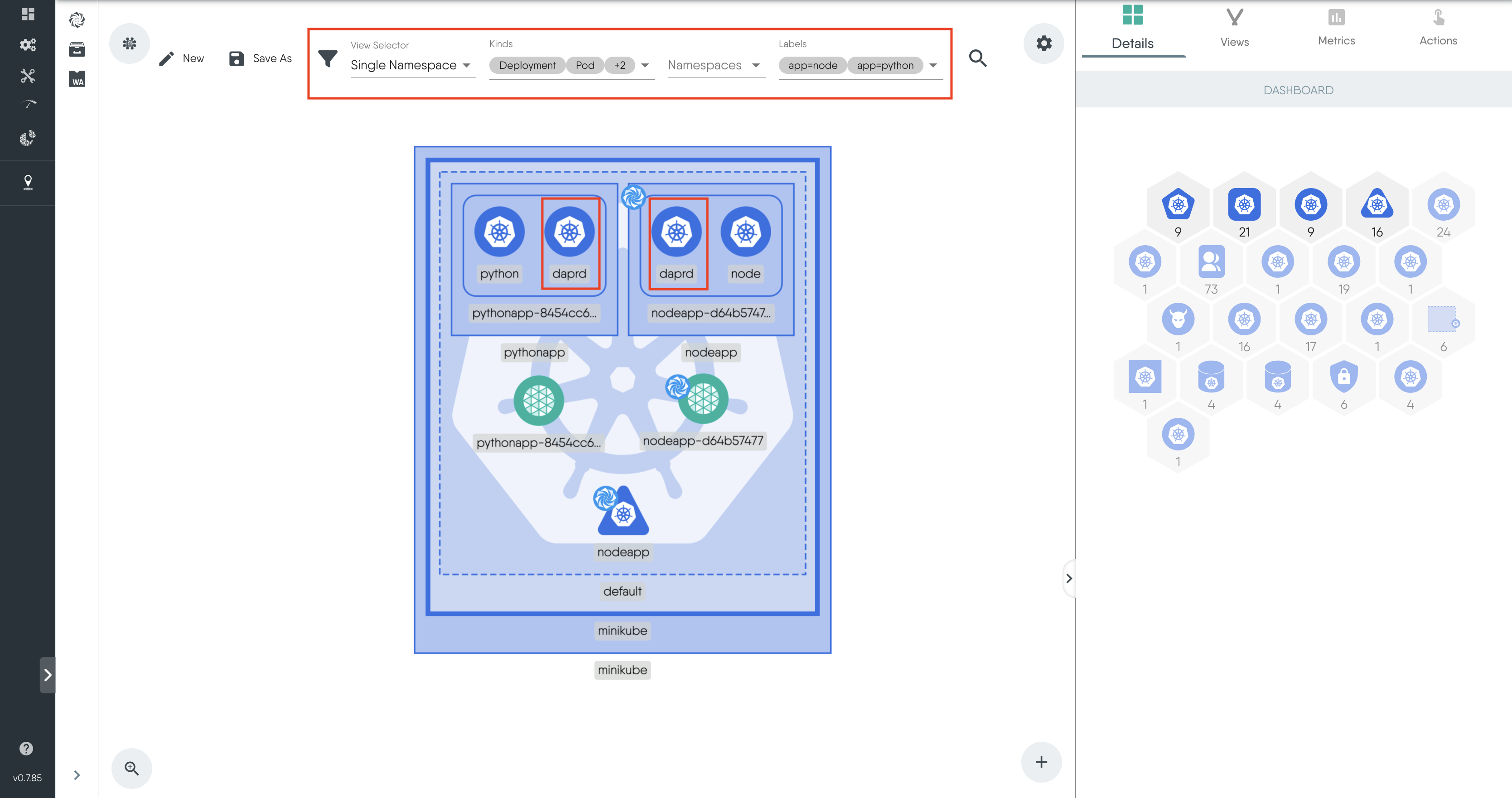 • For Kinds select the resources you want to see including Deployments, Pods, Services, Replicaset.